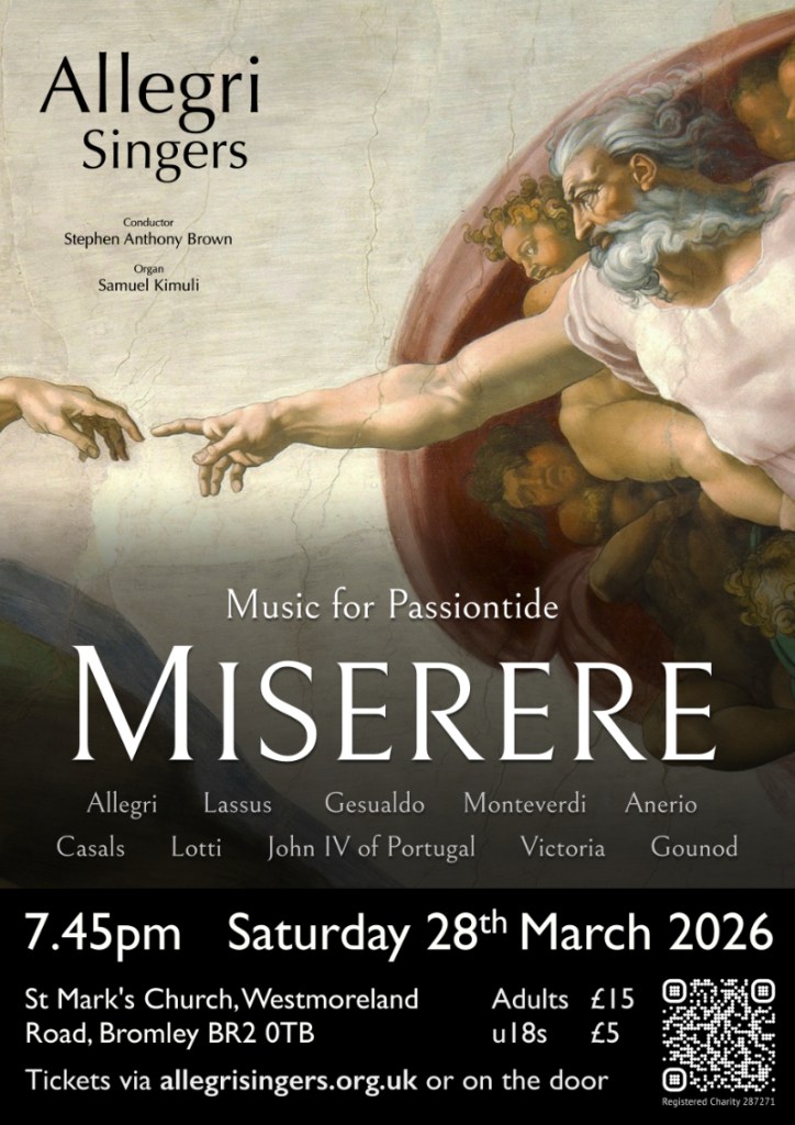 On 28th March, we present sacred music for Passiontide, featuring penitential masterpieces from the late Renaissance and early Baroque. The first half journeys from Old Testament lament through works by Lotti, Lassus, Gesualdo, Monteverdi, and Victoria, culminating in Allegri’s sublime Miserereโonce forbidden outside the Sistine Chapel. After the interval, Gounod’s profoundly moving Les Sept Paroles de Nostre Seigneur Jรฉsus Christ Sur La Croix brings us to the foot of the cross through operatic drama and spiritual contemplation.